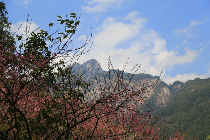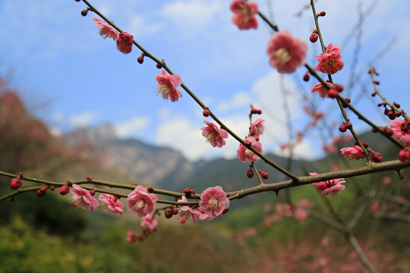 近日,隨著氣溫的不斷上升,黃山風景區南大門外的黃山花穀中百餘株鮮豔如霞的宮粉梅悄然開放,在春風裏搖曳生姿,讓人忍不住駐足觀賞,拍照留念。遠遠看去,花色稍淡,與周圍的樹木構成一幅淡雅的水墨畫。