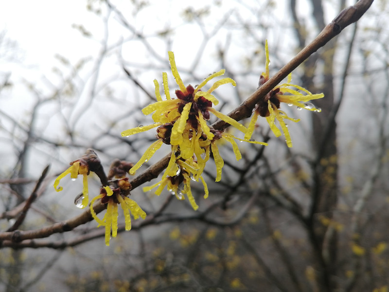 據悉,金縷梅生長在黃山海拔600米至1750米的山上,每年是2月到4月盛開,是黃山上最早盛開的花,花朵小花期較長,雨中的它也如同高傲的仙子,毫不畏懼的接受著大雨的洗禮,依舊挺立枝頭,不落不墜,特別好看。