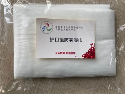 為簡化抗菌防霧塗層液的塗覆工藝,經集思廣益,科研團隊借鑒日用濕巾的原理,將無紡布浸潤在一定濃度的抗菌防霧塗層液中製成抗菌防霧濕巾,用該濕巾輕輕擦拭護目鏡片,即可使防霧塗層均勻塗覆並牢固粘附在鏡片表面上,有效解決醫用護目鏡起霧問題。