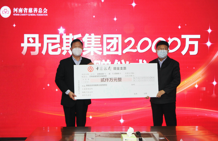 【香港商報網訊】記者 王皓萍 報導:2月27日,丹尼斯集團疫情防控慈善捐贈儀式在河南省慈善總會舉行。丹尼斯集團向河南省慈善總會捐贈2000萬元,支持全省新冠肺炎疫情防控工作,這是新冠肺炎疫情發生以來,河南省慈善總會接收的最大一筆捐贈資金。