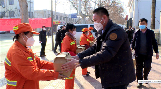 近日,山東省平陰縣全福農莊經營者拉着兩車食品禮盒來到平陰縣環衛綠化管護中心,慰問疫情期間值守一線的環衛工人。