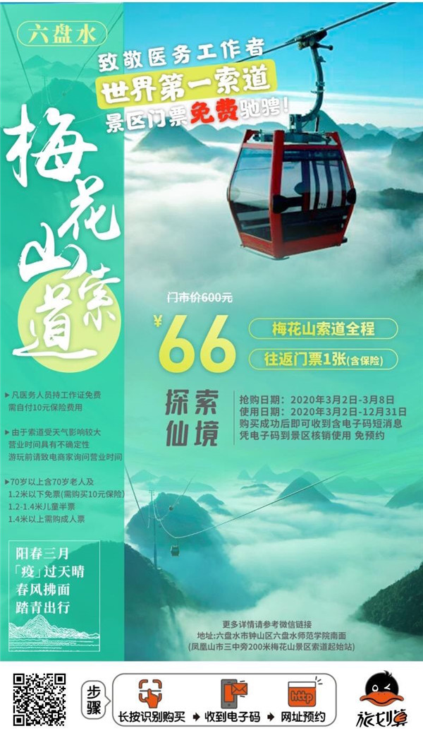 此外,六盤水梅花山索道搶購價:66元。搶購日期:2020年3月2日-2020年3月8日。使用日期:2020年3月2日-2020年12月31日。確認短訊:購買成功後即可收到含電子碼的手機短訊(1個電子碼)。使用方式:收碼後直接到景區核銷使用 (免預約)。套餐包含:梅花山索道全程往返單人票(含保險),景區從恢復開放之日起至2020年12月31日對全國醫務工作者實行梅花山索道免費(需購買10元保險),景區門票免費,有效證件(醫師證或者護士證)。70歲以上含70歲老人免票(需購買10元保險) ,但需要本人身份證及監護人陪同;1.2米(不含)以下的兒童免票 (需購買10元保險),需監護人陪同;1.2米(含)-1.4米(不含)以內的兒童半票,1.4米(含)以上的兒童按成人票收取。景區一旦確認核銷,兌換門票後,電子碼短訊立即失效。