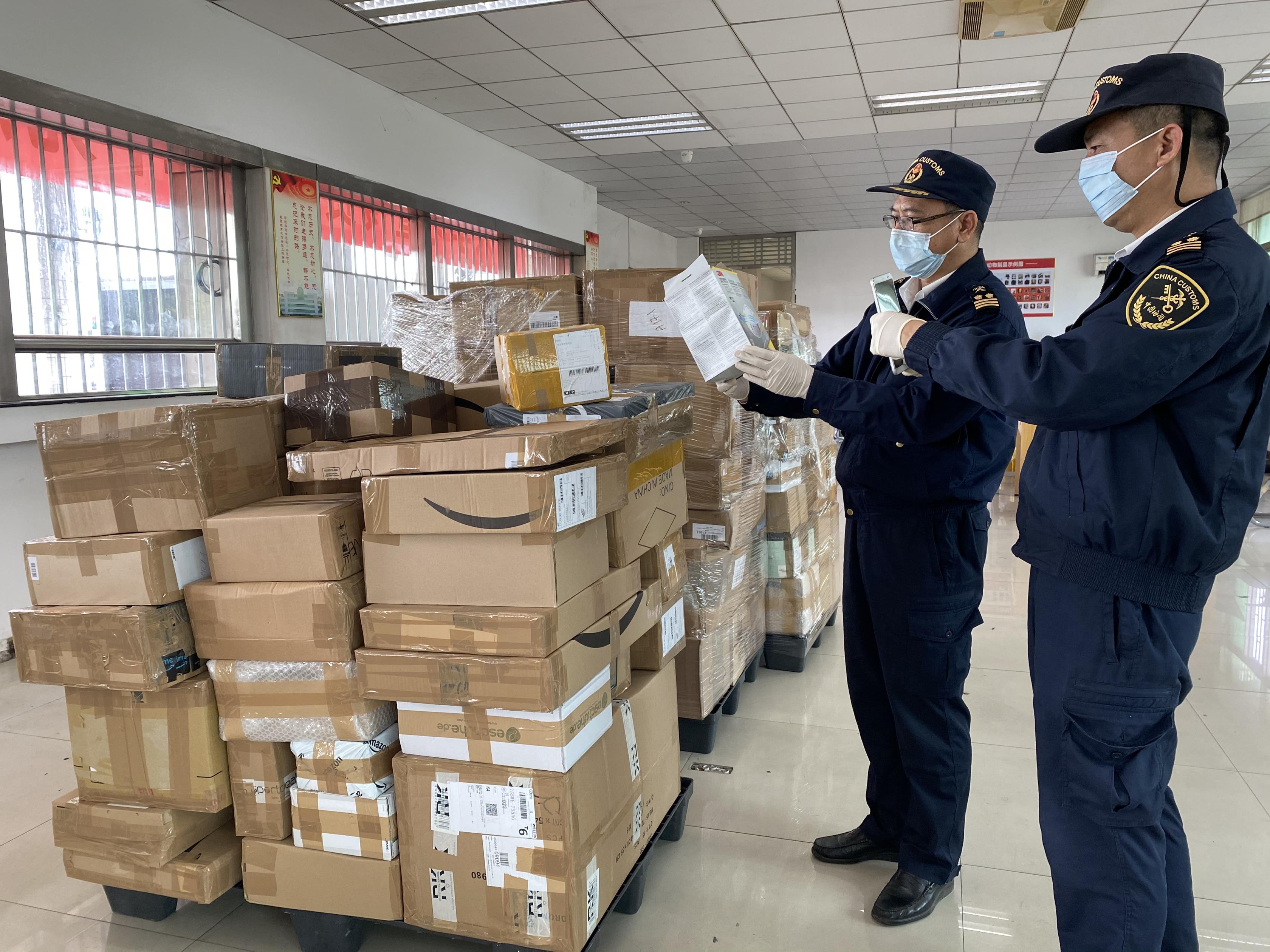 黃埔海關所屬鳳崗海關關員對跨境電商管道防疫物資進行驗放