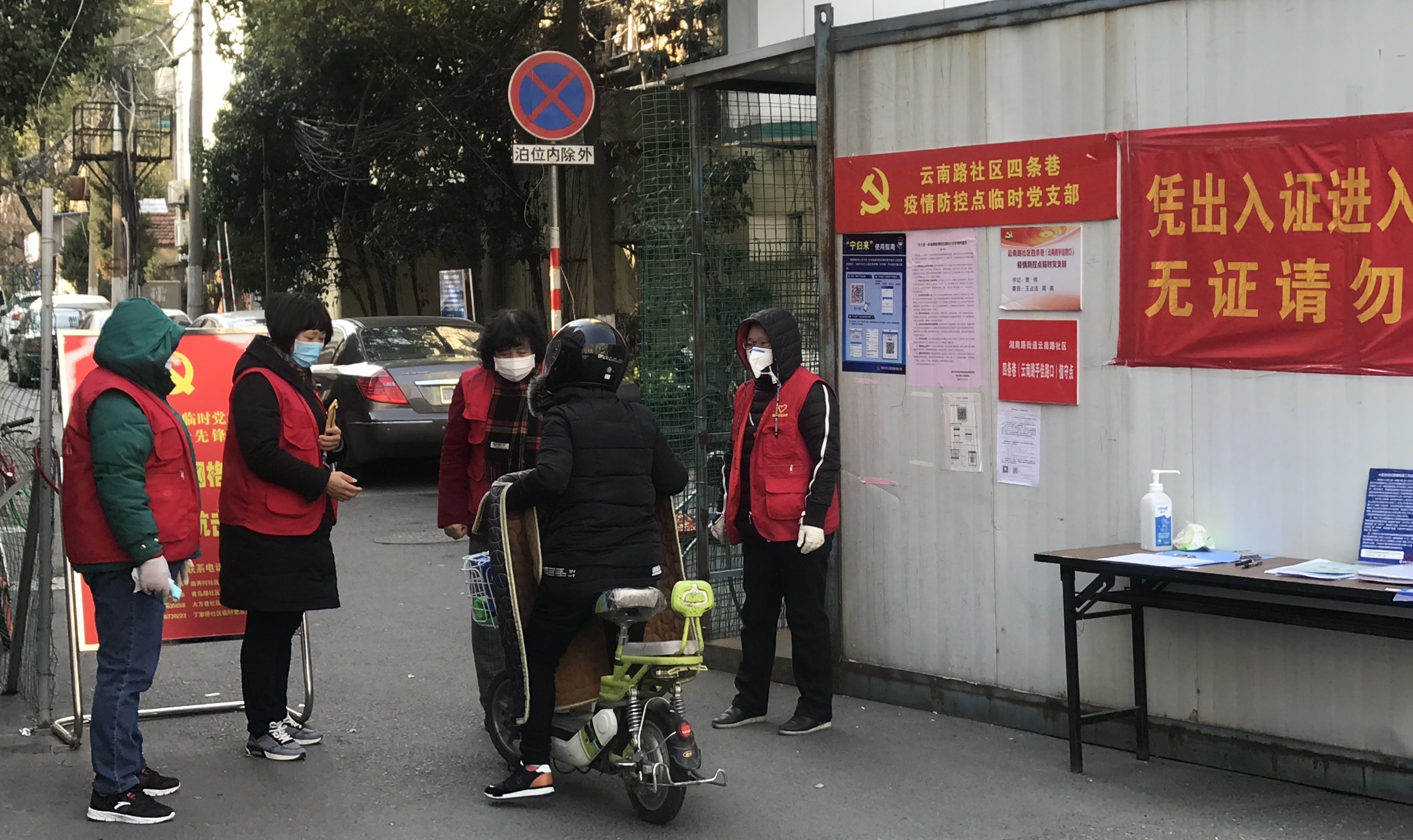 省城南京以小區封閉式管理應對驟然襲來的疫情。已從職工崗位退休多年的謝女士是南京市鼓樓區湖南路街道雲南路社區的老黨員,每天上午九點至下午六點她都會佩戴口罩、身着紅色志願者馬甲,與其他志願者一起在其社區重點卡口對過往行人進行體溫檢測並對疑似人員進行登記,她告訴記者這樣的防疫志願工作自己已持續了一個多月,由於該社區流動人口居住較為密集,春節期間她還與社區工作人員一起逐一走訪記錄居民往返情況,並督促檢查外地返程居民在南京警方的「寧歸來」平台進行登記。目前,該轄區仍有部分流動性較小的出入口處於封閉狀態,而謝女士所在卡口則是該轄區主要出入通道之一。