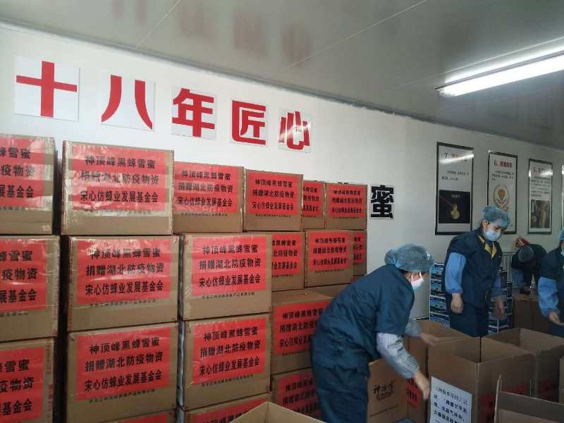 【香港商報網訊】記者 張曉磊 報導:疫情肆虐,人間有愛。黑龍江神頂峰黑蜂產品公司獲悉《武漢協和最新消息醫治計劃方案》提及蜂蜜對治療「新冠肺炎」有一定效果後,開足馬力生產雪蜜,打響防控新冠肺炎阻擊戰,主動擔當,為國解憂為民排難。2月28日黑蜂哥戰立新帶領黑龍江神頂峰黑蜂產品公司和虎林市森蜜蜂業農民合作社的蜂友們急國家所需,正式搶先復工,將捐贈的800箱黑蜂雪蜜緊急發往武漢同濟人民醫院、孝感市漢川市等4家人民醫院,不畏疫情風險積極開展「抗疫情、獻愛心」捐贈活動,書寫了「一方有難 八方支援」的時代讚歌。