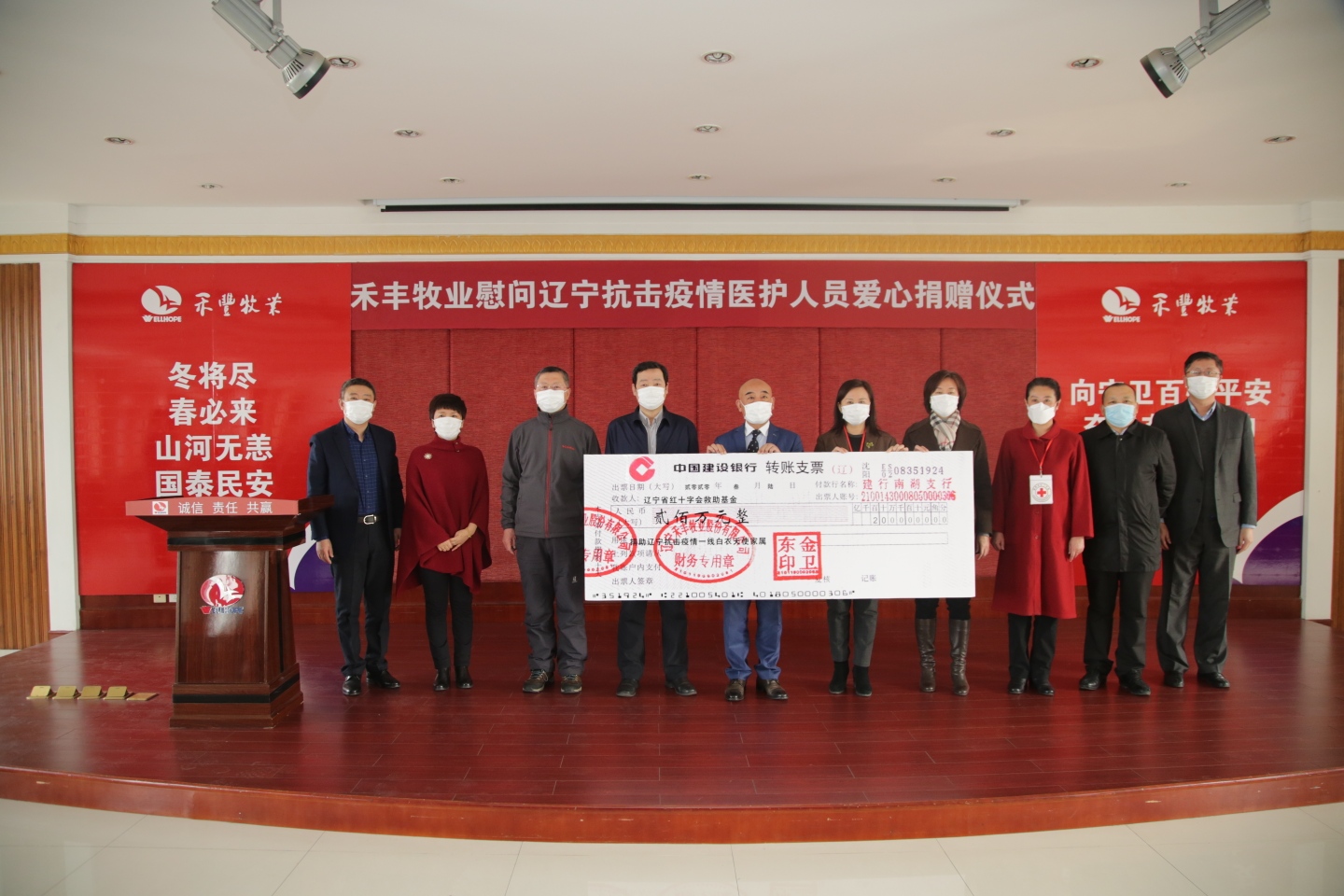 投之以挑,報之以李。禾豐牧業能夠順利復工復產,離不開前線醫護人員對疫情的有力阻擊。為讓英雄們放心、以解後顧之憂,向遼寧省紅十字會捐款200萬元,專門用於為該省援鄂和省集中救治中心醫療隊員家庭採購配送蔬菜、奶、肉、蛋、油等名特優新產品,解決每個家庭戰「疫」時期日常採買的問題,盡一份微薄之力,以此表達對「白衣戰士」們的無限敬意。