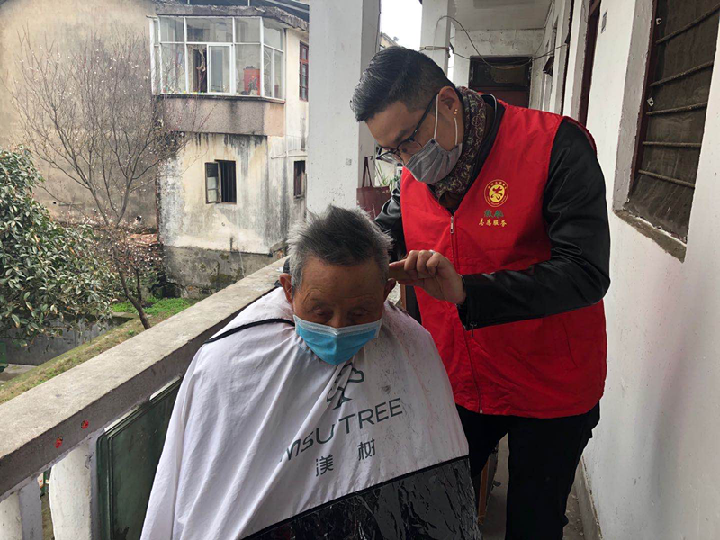 義剪志願者徐俊經營著一家美容美髮店,通過社區居民點單,接到社區派單,做好理髮工具的消毒後便來到李金安老人家中為他理髮,清爽乾淨的髮型讓老人十分滿意。“這幾天天氣不好,我行動也不怎麼方便,今天理髮師上門給我剪頭髮手藝真好很滿意,我不用專門跑了,很感謝他們社區和志願者。”