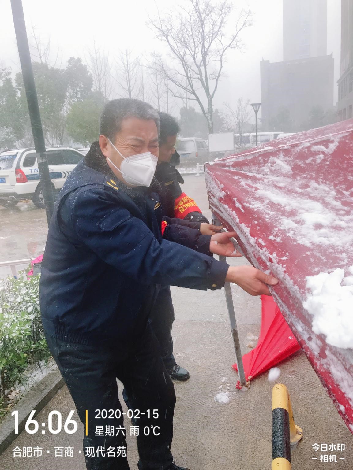 2月15日,風雪交加,柏堰科技園城管大隊許忠貴帶領大家搭建臨時值班房