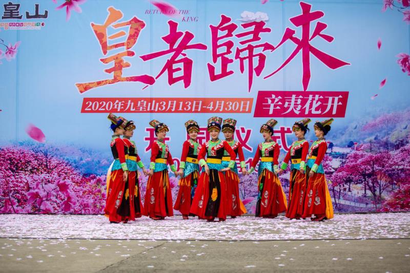 九皇山花溪景,以縈繞半山的辛夷花林為基礎,綿延不斷形成大規模的辛夷花海。每年3-4月,大片盛開的辛夷花漫山遍野,頗為壯觀。這裏,萬畝辛夷花依山成勢、層層疊疊,如雲似霞、花香四溢,到處都是一派醉人的春色,吸引了不少遊客前來賞花。開幕式上,《羊皮鼓舞》、《雲中歡歌》、《雲上沙朗》、《又見北川美》等獨具羌族特色的傳統民俗歌舞,展現了羌族人民的似火熱情,嘹亮的歌聲更是唱出了北川羌族兒女幸福、美滿的生活。