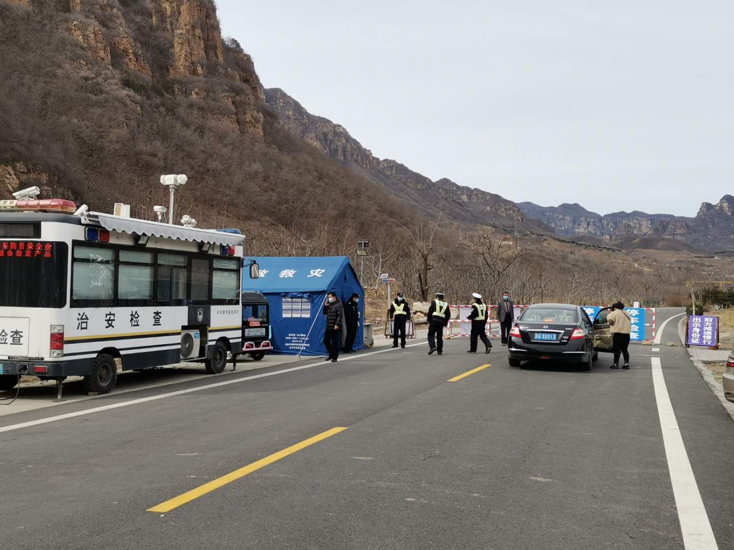 位於長城腳下的金海湖鎮彰作村與河北省承德市興隆縣陡子峪鄉的水廠、龍門兩村毗鄰。彰作村是水廠、龍門兩村村民出行的必經之路,村東北一條狹長的鄉間小路是連接三村的重要紐帶。隨着疫情形式的日益嚴峻,如何避免疫情過境流入,成為兩地三村防疫工作的重中之重。為了做好三村出入車輛人員的管理,兩地鎮鄉政府、屬地派出所積極溝通協調,在位於三村交界處的治安綜合檢查站設置「三村聯合檢查點」,三個村的16名村級執勤人員嚴格執行24小時值勤輪班制度,對來往車輛和人員進行全面排查、信息登記和體溫檢測,嚴防疫情輸入,確保「不漏一車一人」。同時,陡子峪鄉每天還派出2名民警、1名醫務人員24小時堅守,聯勤聯動,協同開展工作,共同打贏這次場防疫情防控阻擊戰。