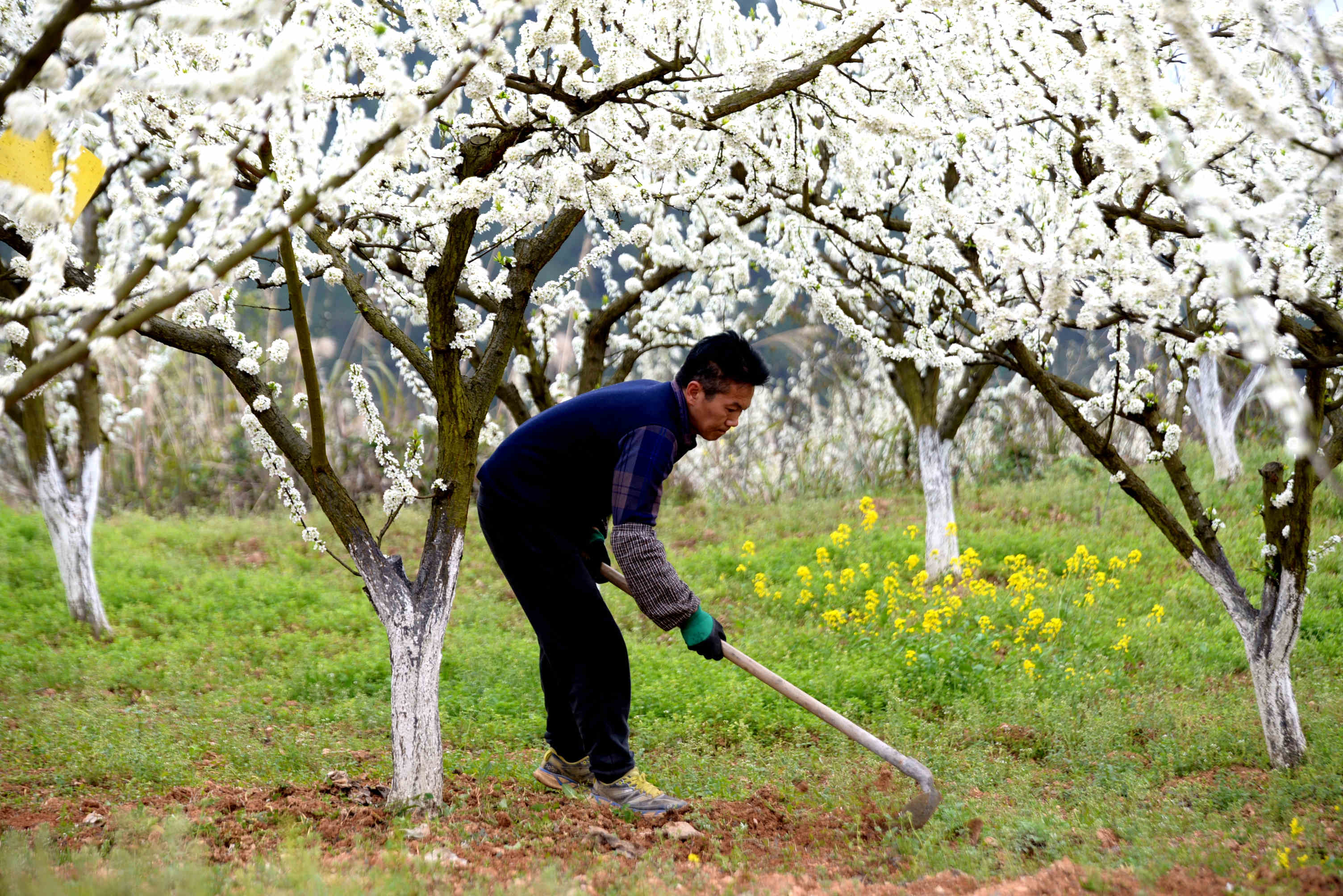 果農正在對果樹進行鬆土