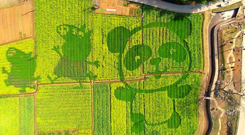油菜花繪製的創意可愛卡通景觀圖與綠水青山、阡陌房舍相映成趣