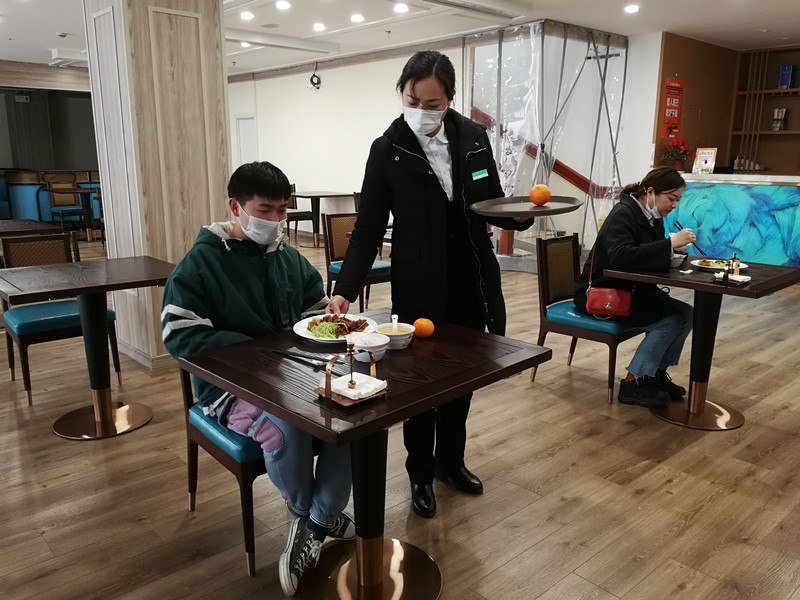 同時,酒店餐廳目前已進行特殊佈置,每個餐桌之間保持1.5米以上的距離,並且提示客人每個餐桌只坐一人。