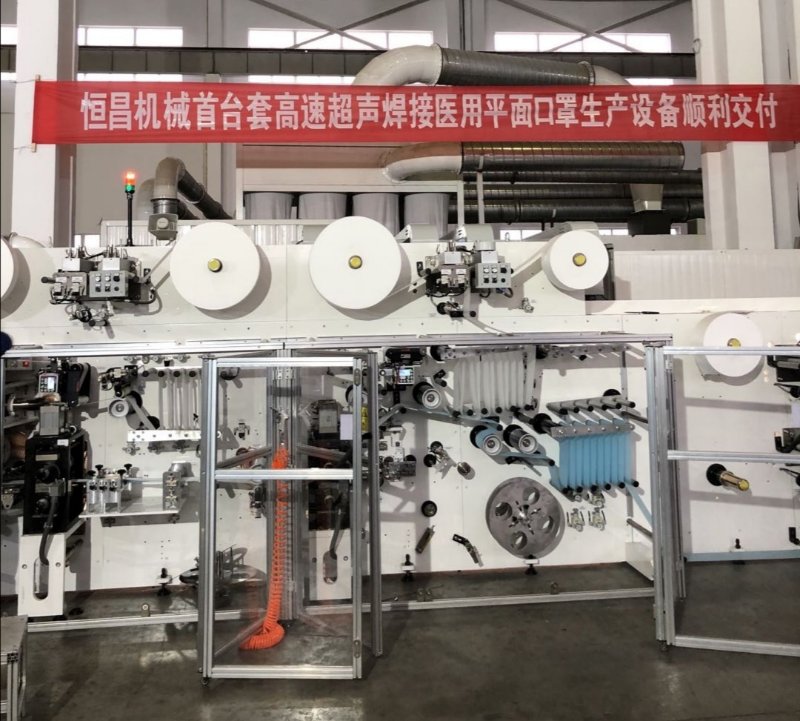 恆昌公司研製的此台高速醫用平面口罩生產設備,採用超聲波焊接技術,具有技術先進、結構合理、性能穩定、操作方便、機出產品功能齊全等特點,實現了從無紡布原料到成品口罩的全流程自動化生產,每分鐘能生產500片平面口罩,產品合格率大於98%,生產效率大於85%,不停機自動拼接原材料,24小時連續生產每天產能可達70萬隻口罩;同時,全套設備採用模塊化設計,便於後期維護和技術升級。