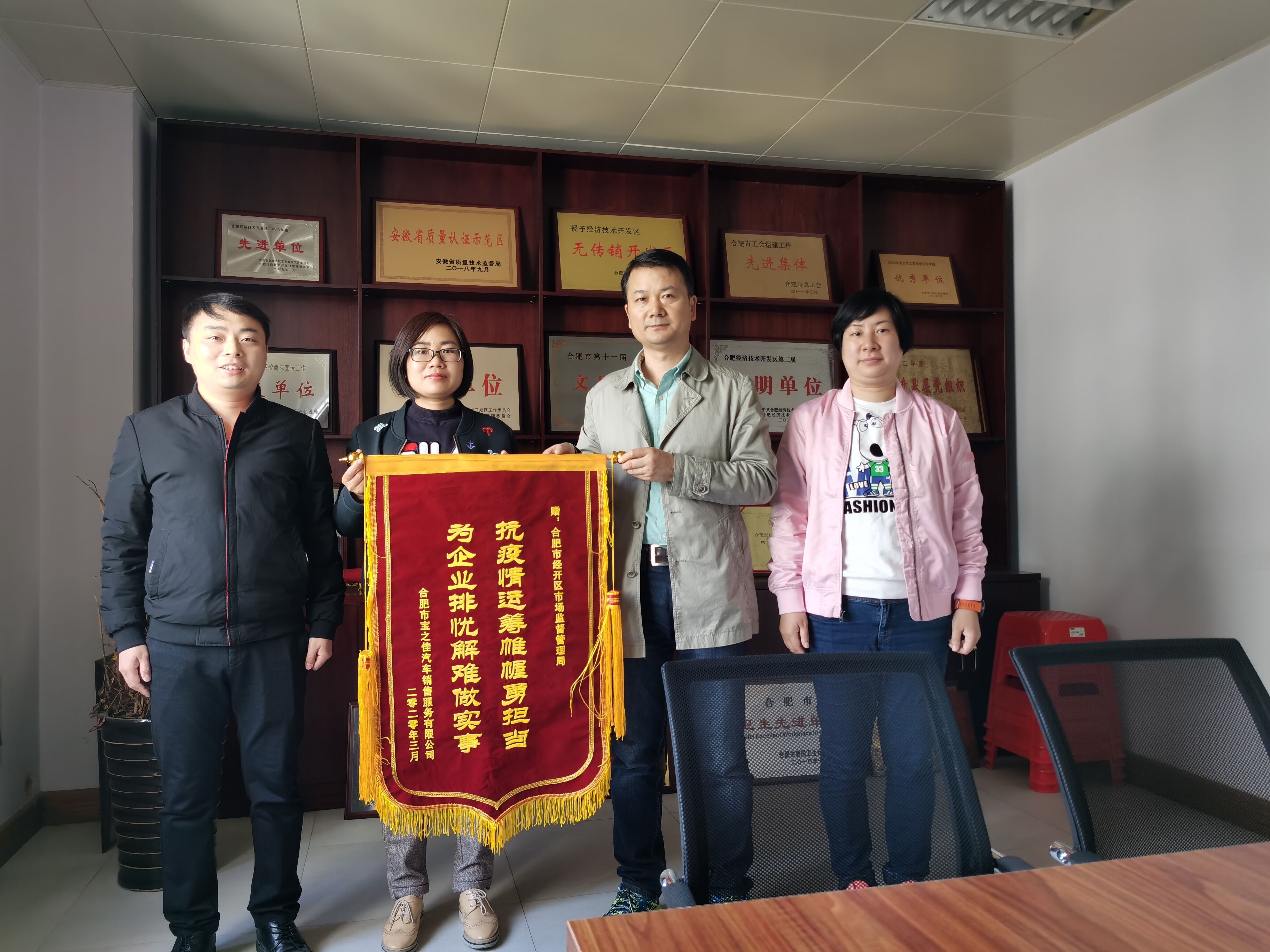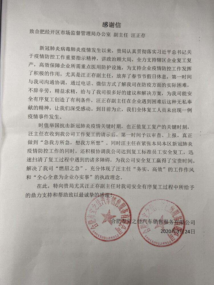 【香港商報網訊】「我不要你覺得,我要我覺得」。疫情之下,政府部門推動復工復產成效如何?關鍵要看企業怎麼樣「覺得」。日前,合肥寶之佳汽車銷售服務有限公司將一面寫着「抗疫情運籌帷幄勇擔當,為企業排憂解難做實事」的錦旗和一封「飽含情誼」的感謝信送到了合肥經開區市場監督管理局。