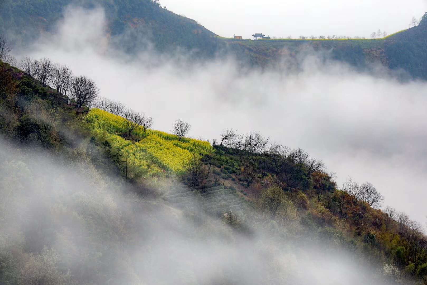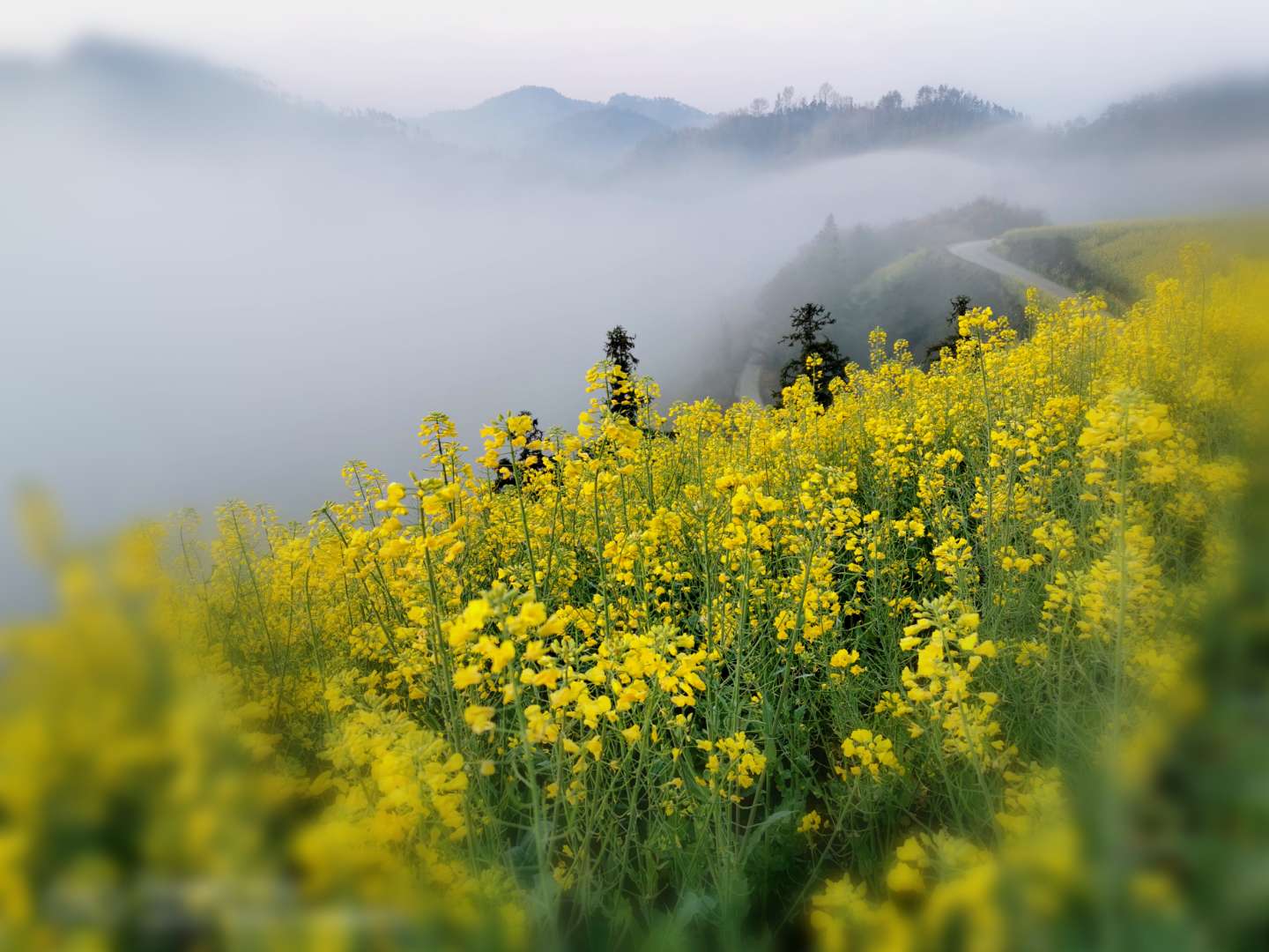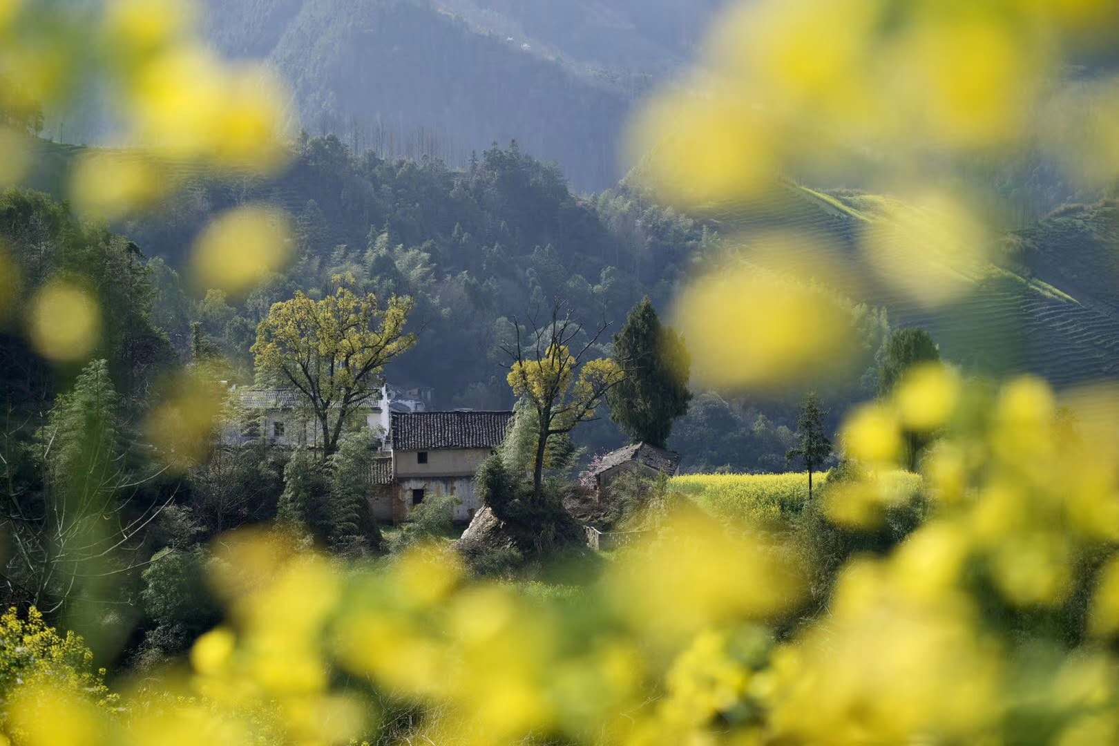 而最佳攝影時間一般在早晨7時左右,薄薄的霧氣籠罩在樹上,似有似無,農家的小屋若隱若現,花叢中忽露出飛簷翹角,粉牆黛瓦在黃色的掩映下,就如中國山水畫般詩情畫意。