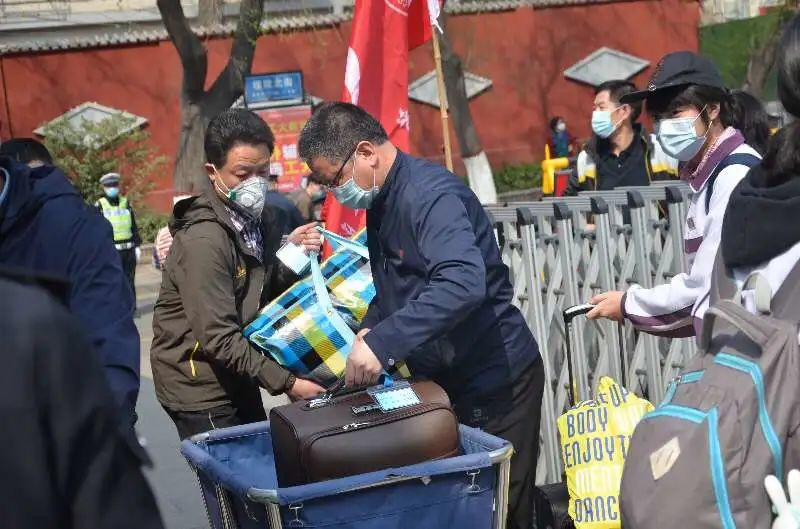 在太原十八中,黨員志願者幫助學生將行李搬運到宿舍,家長止步于校門口