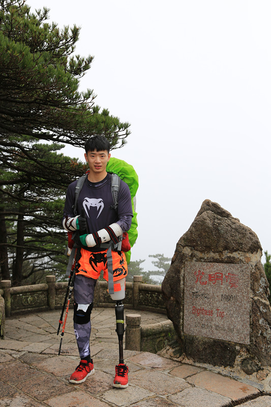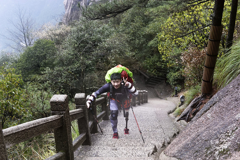 【香港商報網訊】3月26日,黄山细雨纷飞。不少來黃山的遊客登山途中見到這樣的場景:一個年輕帥氣的小夥雙手拄著兩個登山杖,單腿裝著義肢一步步向山上攀登,他背著重達40斤的偌大的行囊,上面寫著“中國加油!世界加油!”