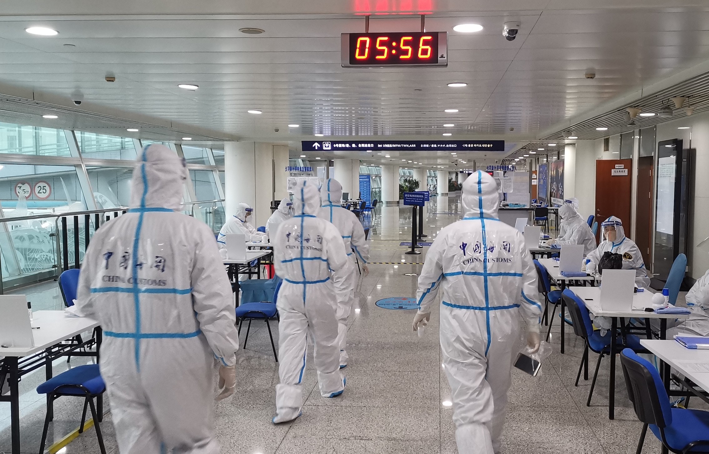 每天一早關員們就要對當天入境的航班和進境旅客進行風險評估,隨着入境航班陸續抵達,緊張的流行病學調查和採樣工作也隨之展開。在疫情高傳染性風險和連續作戰的疲憊面前,駐守在口岸一線的海關關員們堅守職責,通常身着密閉的防護裝備連續6、7個小時無法喝水、進食,也無法去洗手間。