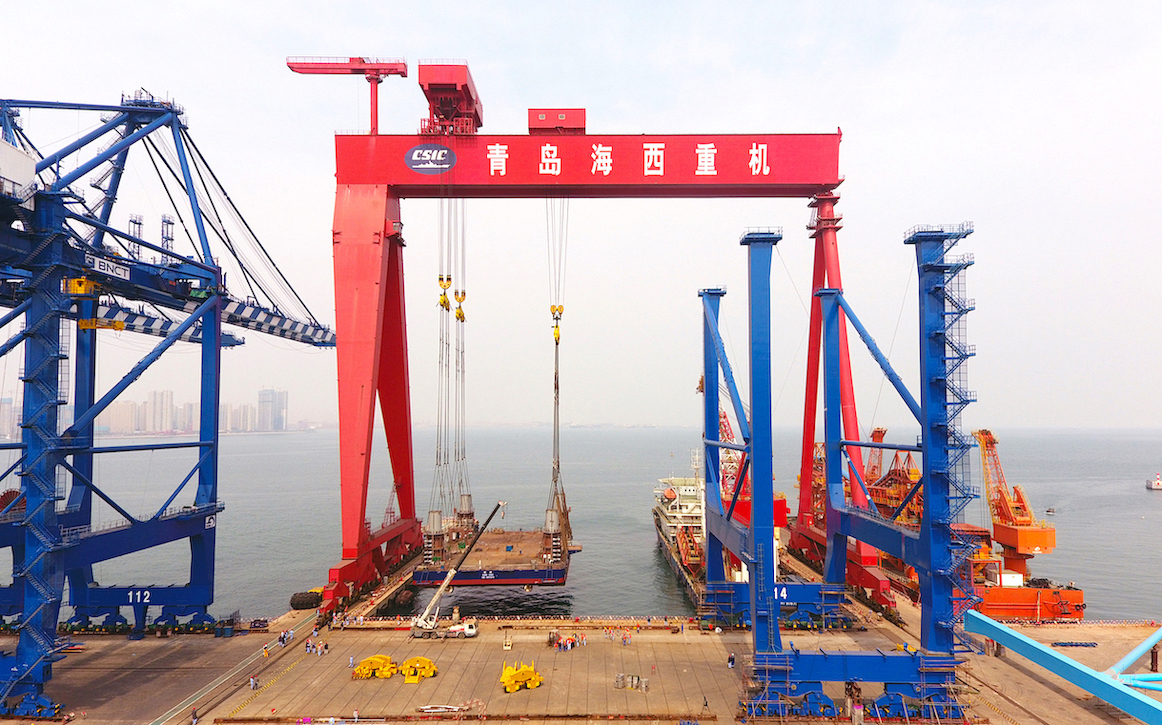 【香港商報網訊】3月31日,青島海西重機有限責任公司承接的華東院306自升式海上勘探平台在青島西海岸新區順利完成吊裝下水。據悉,在該項目前期建造策劃階段,青島海西重機大膽提出了利用1600噸龍門吊整體吊裝下水的設想。經過一系列重量預估及方案論證,最終核定吊裝下水重量接近1440噸。