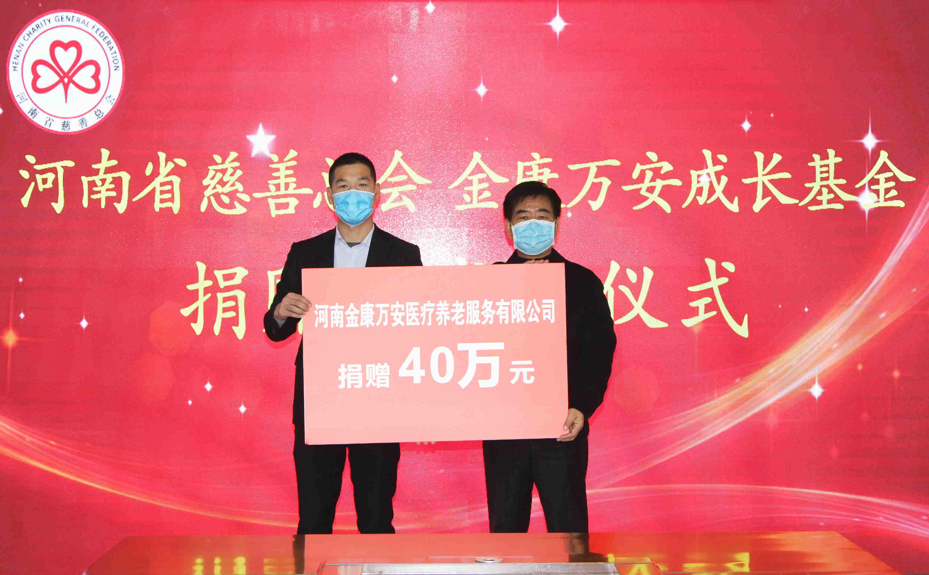 在大家的共同見證下,河南金康萬安醫療養老服務有限公司(下稱「金康萬安」)向河南省慈善總會捐贈50萬元成立「金康萬安成長基金」,其中王衛峰總經理以個人名義捐贈10萬元,董潁生副會長代表省慈善總會接受捐贈並向愛心企業頒發了捐贈證書和基金證書。