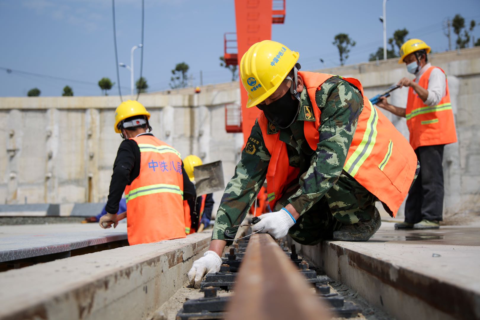 建設者們在對改貌鐵路軌道進行廢渣清理