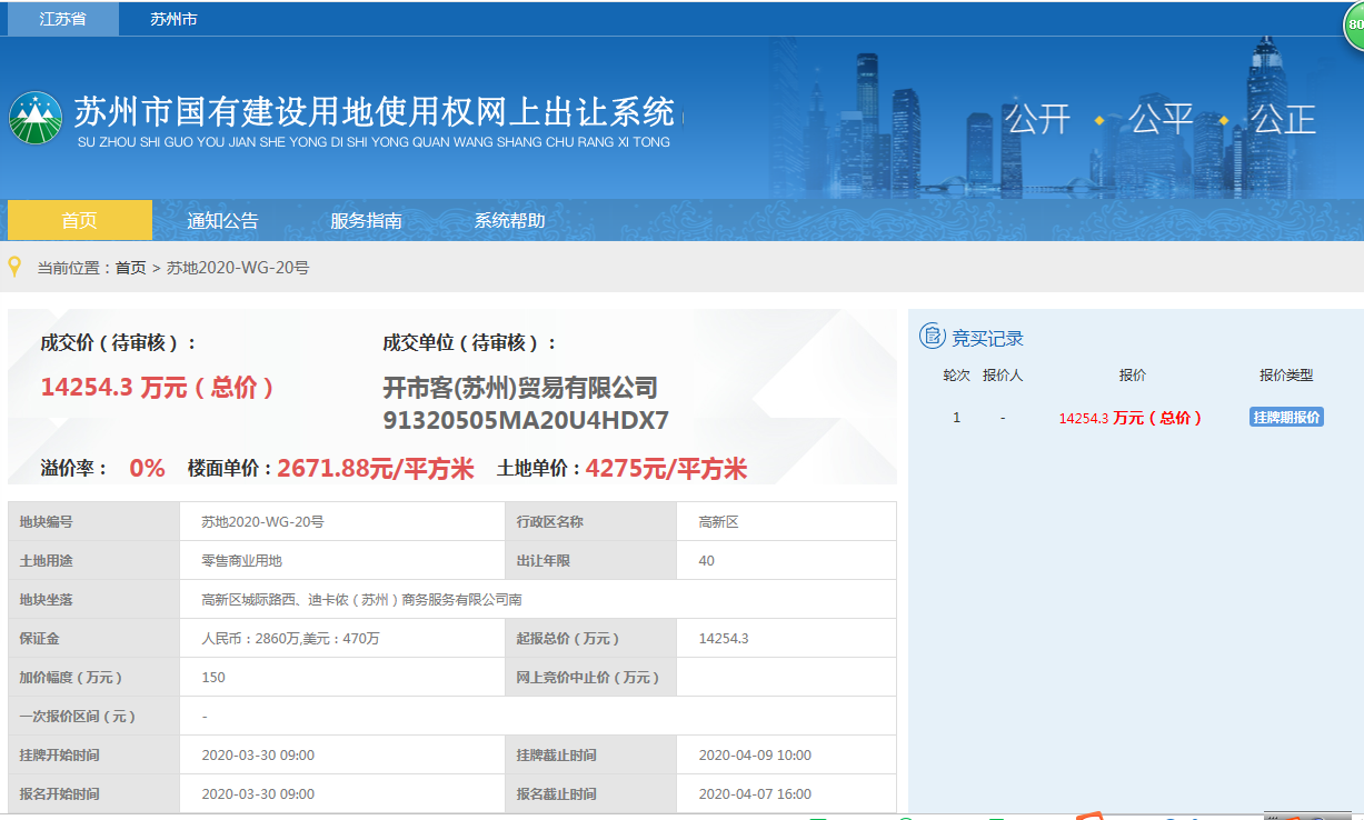 【香港商報網訊】 4月9日上午,開市客(蘇州)貿易有限公司以14254.3萬元的總價拍下了蘇地2020-WG-20號地塊。至此,Costco正式落戶蘇州高新區,這也是繼上海以外Costco落戶中國大陸的第二家城市。