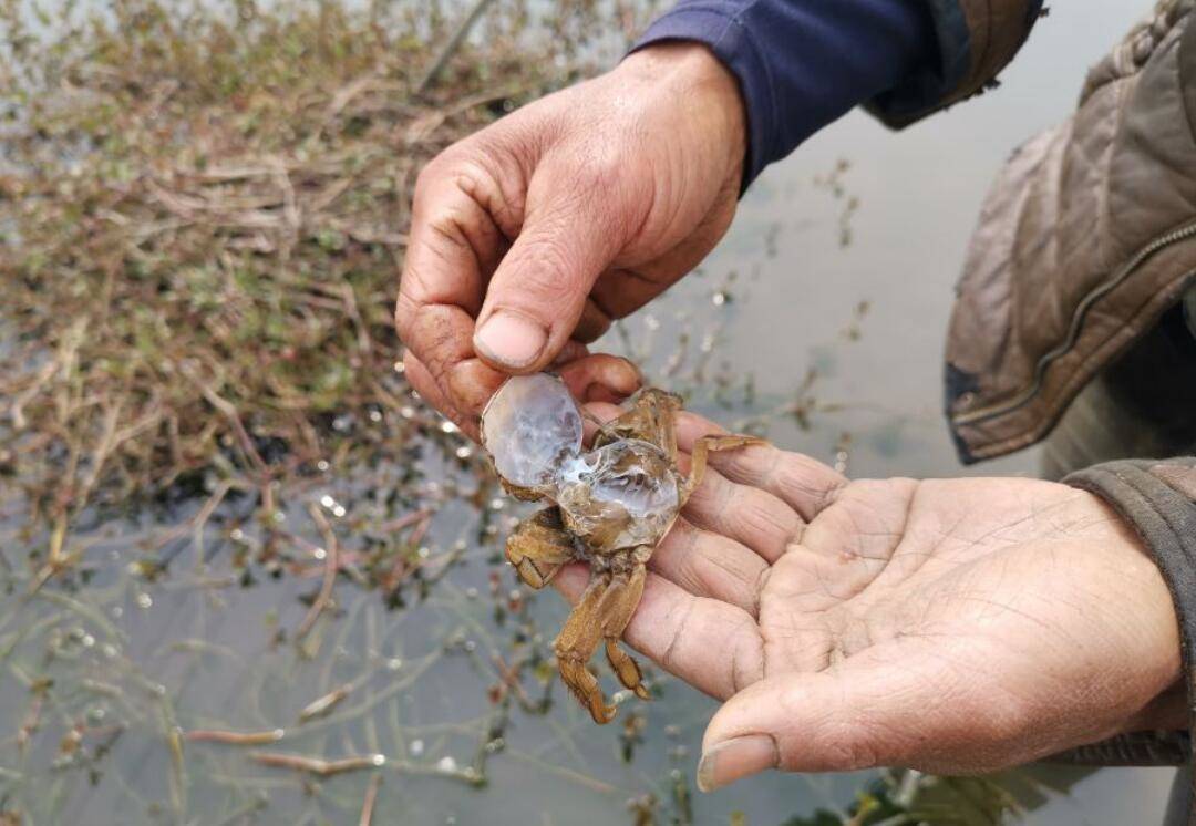 疫情影響發生後,不但影響了螃蟹銷售,也影響了蟹苗的採購。劉渡鎮慶豐村蟹農周小恆今年卻沒那麼著急了。原來,近年來,周小恆逐漸掌握了螃蟹育苗的本事。在蟹塘前,他指着塘邊螃蟹生長中脫下的殼說,「我們自己培育的蟹苗成活率至少8成以上,成蟹單體個頭也大,而從外省買的蟹苗成活率往往不過6成,雖然成本算起來高了一些,但是與最終收益相比,肯定划算,今年的蟹苗除了我自己需要外,也賣了一部分給鄉親們」。