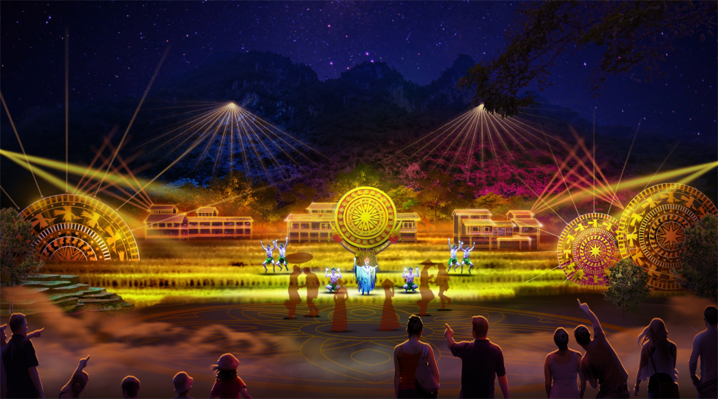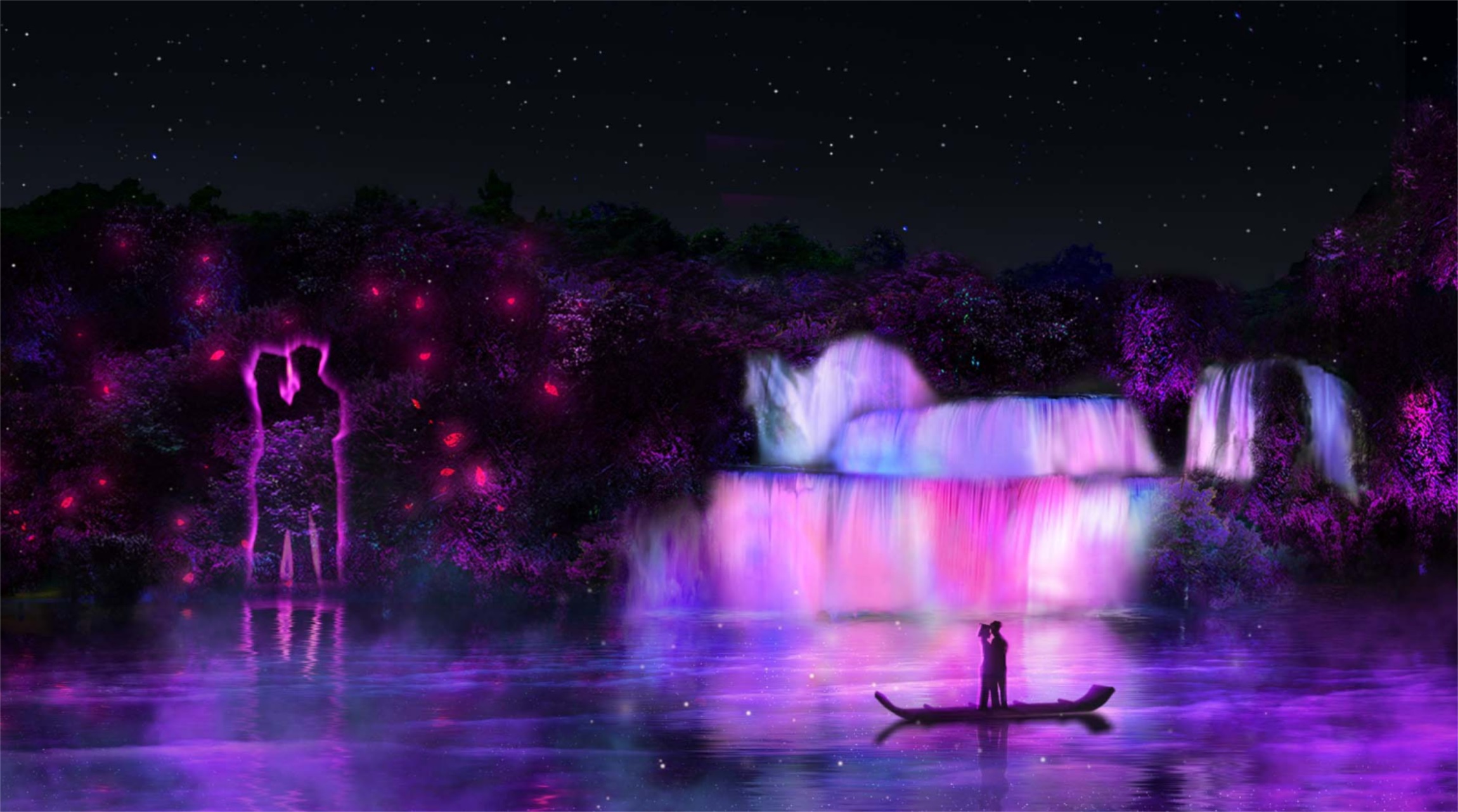 據了解,「奇妙·夜德天」項目總投資約1.2億元,項目配套設施包含叢林棧道、石林景觀、德天寺休憩廣場、瀑布聲動體驗區、擊鼓平台體驗區等。該項目將通過挖掘壯族先民的生活習俗、文化傳承淵源,並藉助高科技的聲、影、動畫、遊戲互動、故事情節演繹等手法還原當時的先民生活遺跡。其中夜遊故事傳承動線有11幕互動體驗環節構成,包含「螞拐節、尋蛙神、入人間、定終身、花賜福、祈雨來」等。夜遊遊客動線將採取夜遊探秘指引循環的方式,開啟夜遊「奇妙·夜德天」主角就是我的奇幻之旅。全程夜遊體驗互動約75分鐘,每日最大接待量約3000人次。