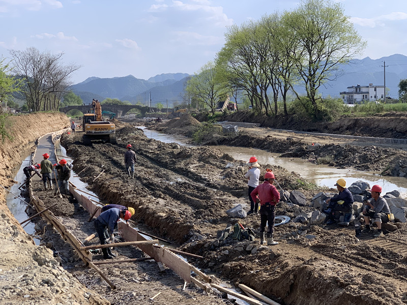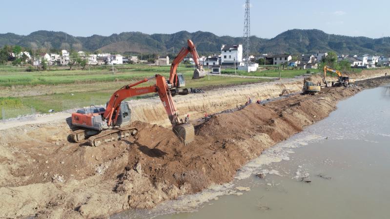 4月14日,在黟縣橫江宏村段治理工程项目現場,十幾臺套大、小型挖掘機穿梭其間,300多名施工人員相互配合,正在進行岸坡加固工程的緊張施工。黟縣橫江宏村段治理工程總投資2900萬元,主要是對橫江宏村龍川河9.91公里河段進行綜合整治,工程受疫情影響,復工時間較計划推遲近一個月,但在主管單位、施工方、監理方等多部門的共同努力下,目前工程已完成二標段建設,其餘一標段和三標段已完成建設任務的80%。