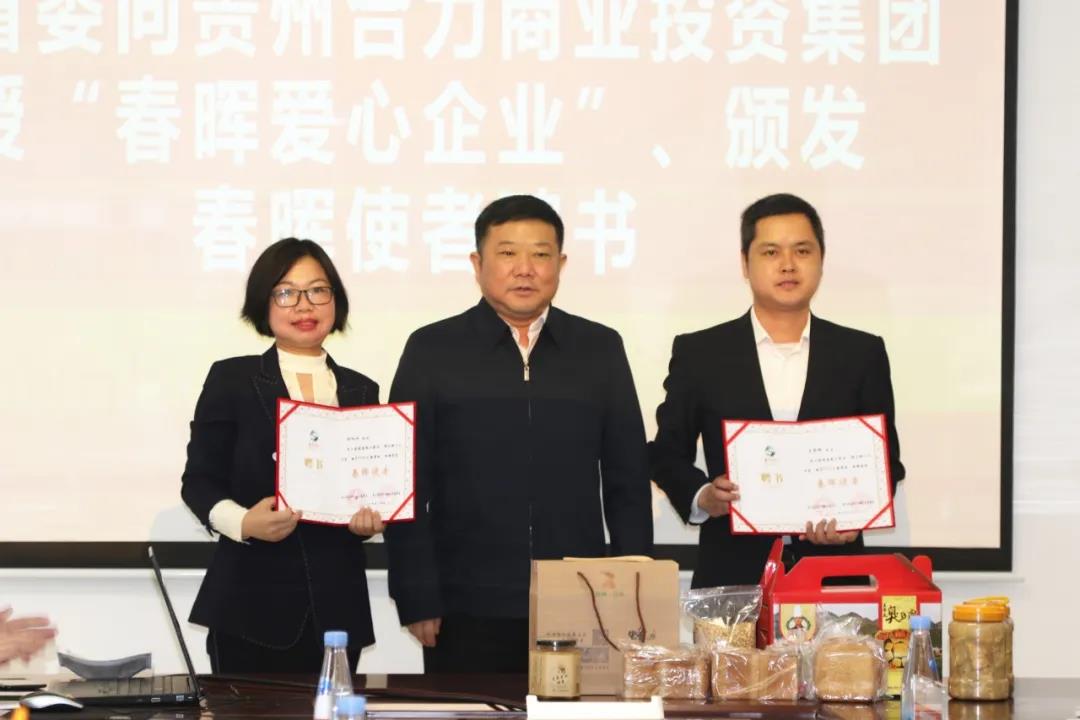 在啟動儀式上,貴州合力商業投資集團副總裁申民明受集團董事長李德祥先生委託,代表貴州合力商業投資集團向貴州省春暉行動發展基金會捐贈公益基金20萬元,鄧守成向貴州合力商業投資集團授「春暉愛心企業」牌匾並為春暉使者頒發聘書。