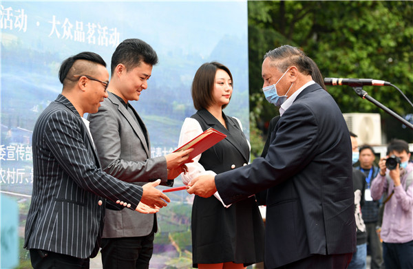 貴州省人大常委會原副主任、省茶葉協會會長祿智明為貴州茶星大使代表頒發榮譽證書 趙松 攝
