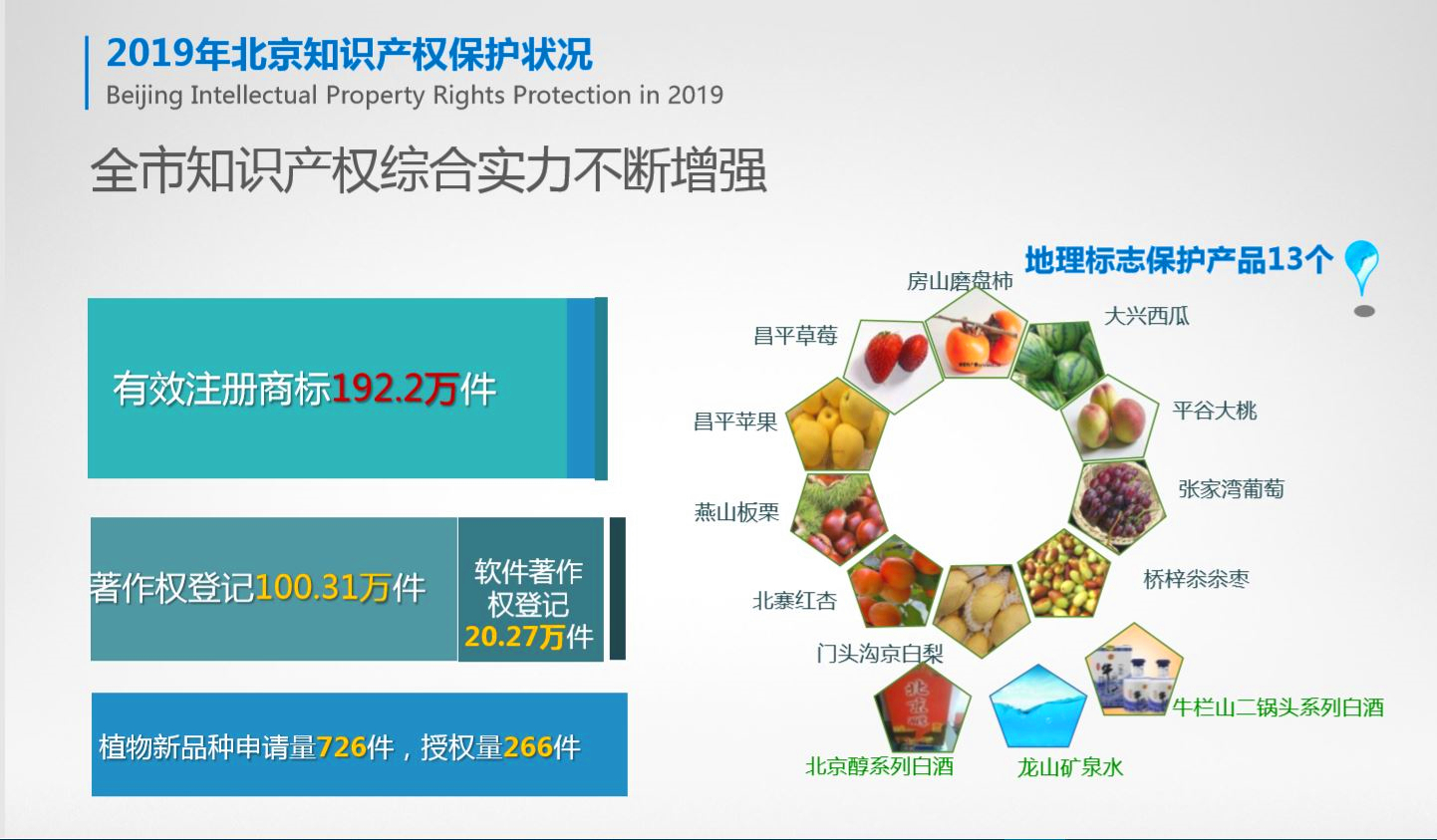 據了解,在2019年國家營商環境評價中,北京市「知識產權創造、保護和運用」指標名列全國第一。在創造方面,根據《中國知識產權指數報告2019》顯示,北京知識產權綜合實力已經連續十年位居全國第一。2019年,全市專利申請量22.61萬件,其中發明專利申請量12.99萬件,發明專利佔比全國最優;專利授權量13.17萬件,其中發明專利授權量5.31萬件。PCT申請受理量0.72萬件。全市每萬人發明專利擁有量達到132件,居全國首位,是全國平均水平的近10倍。此外,全市商標申請量54.66萬件,商標註冊量47.46萬件,有效商標註冊量達192.2萬件。全市著作權登記量100.31萬件,繼續保持全國首位。農業植物新品種申請量為726件,植物新品種授權量為266件。共有平谷大桃、大興西瓜等地理標誌產品13件,核准使用地理標誌保護產品專用標誌的企業總數53家。