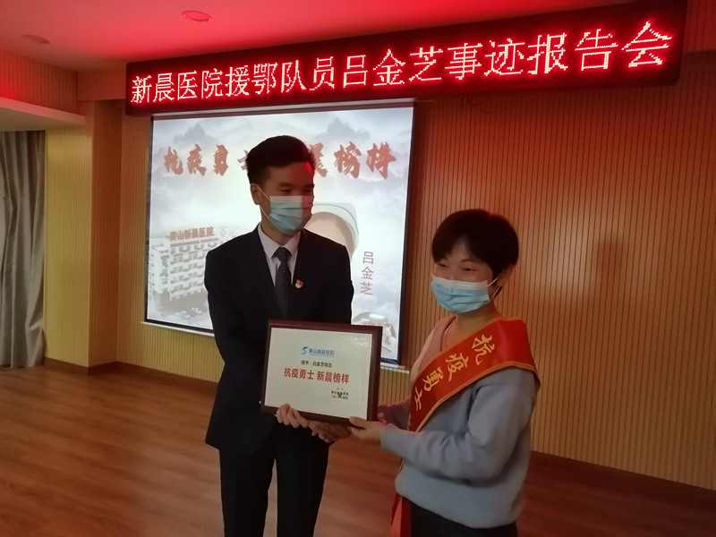 呂金芝在援鄂的34個日日夜夜裏,以仁心醫術和責任擔當,書寫了愛的樂章。而今,她完成任務凱旋歸來。在當天的報告會上,浙江和康醫療集團領導宣讀了嘉獎令,黃山新晨醫院授予她“逆行勇士,新晨榜樣”獎牌。