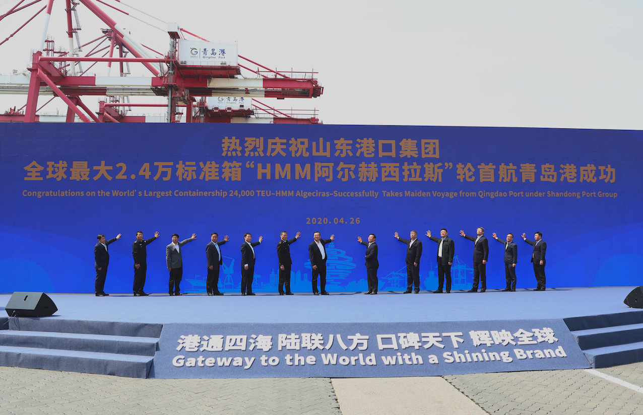 【香港商報網訊】記者 齊薇然 報導:4月26日,載箱量2.4萬標準箱的全球首艘最大集裝箱班輪——THE聯盟“HMM阿爾赫西拉斯”輪首航儀式在山東港口青島港前灣三期集裝箱碼頭81泊位舉行,標誌着山東港口集裝箱業務邁入24000標準箱“大船時代”。
