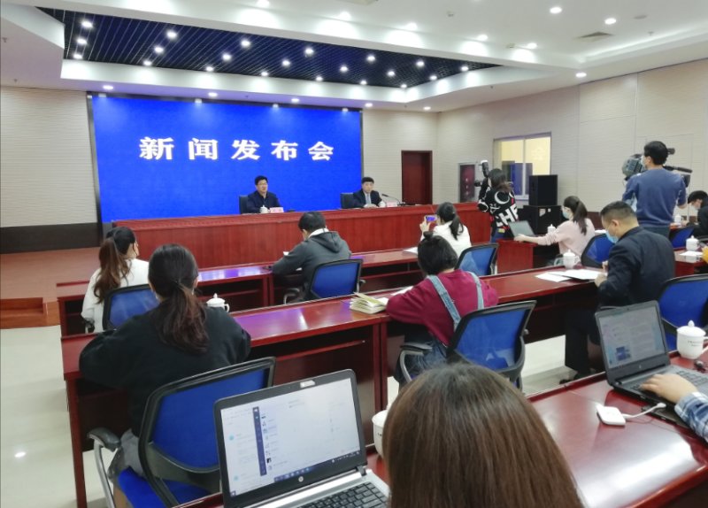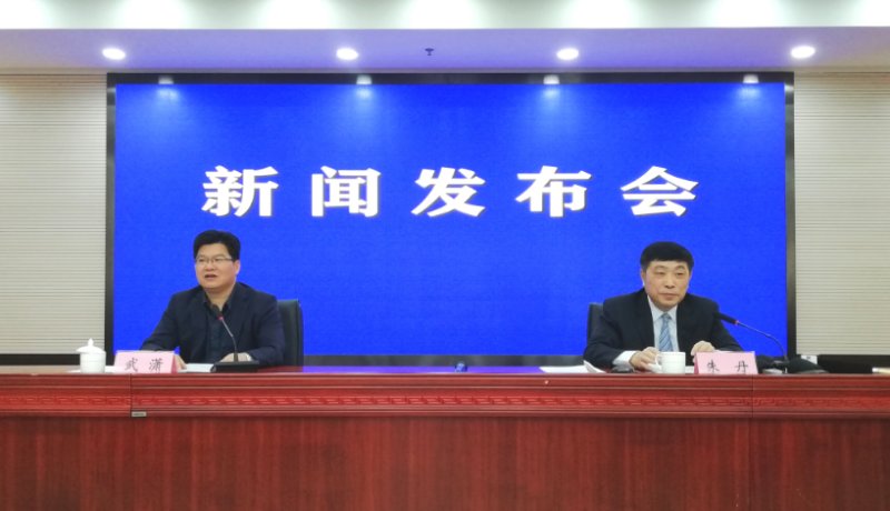 加快推進穩外貿穩外資促消費工作新聞發佈會現場,安徽省委宣傳部新聞發佈處處長武瀟(左)主持發佈會,省商務廳副廳長朱丹介紹相關情況並回答記者提問(孫軍/攝)