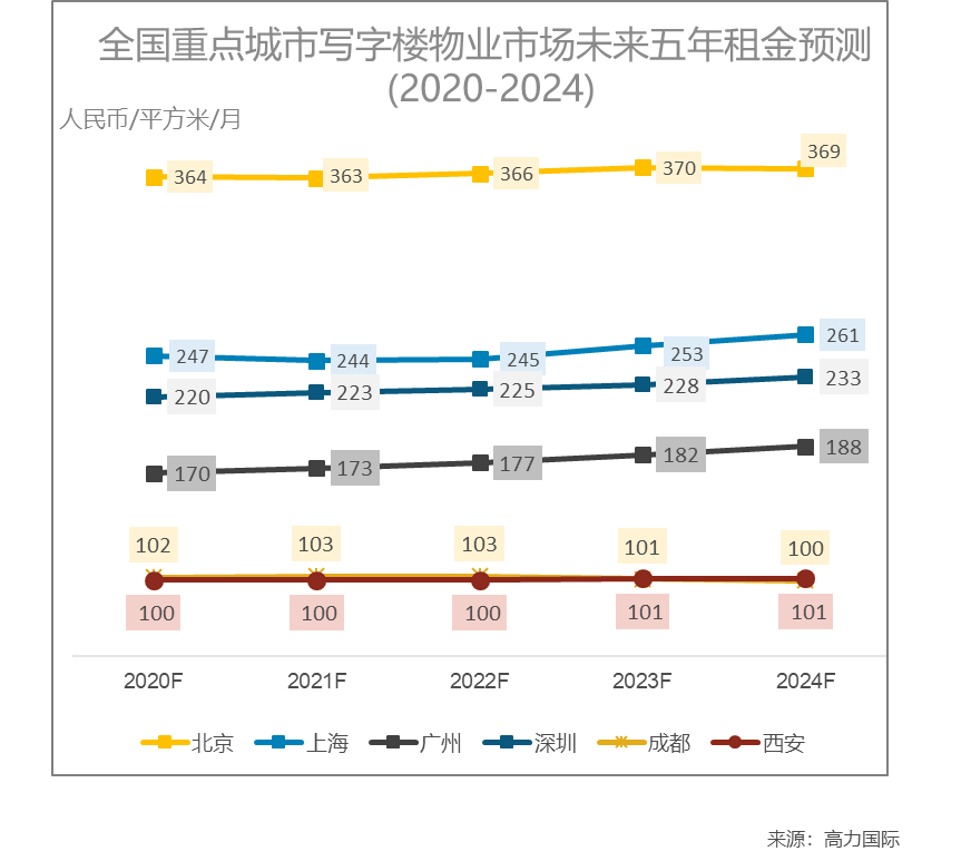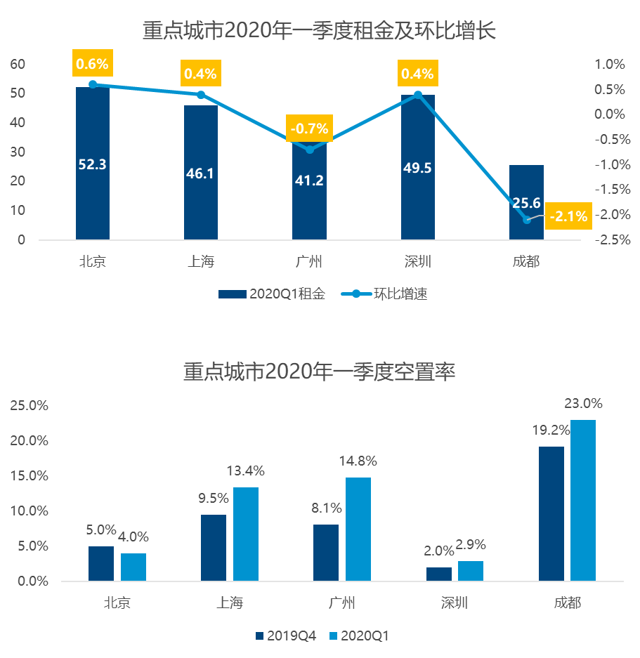 據高車國際的統計顯示,全國各大重點城市寫字樓租賃需求受到抑制,凈吸納量處於較低水平。以上海為例,2020年第一季度,新冠疫情導致整體市場活動處於停滯狀態,各類需求受到短期壓制,其中CBD共錄得-12,600平方米的凈吸納量。其他各大重點城市如上海、北京、廣州、深圳、成都及西安等寫字樓租金均有所下降,其中北京平均凈有效租金為372.9元每平方米每月,環比下降2.5%。
