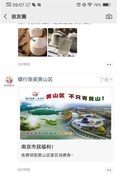 【香港商報網訊】4月30日,安徽黃山區首批1000萬元旅遊消費券通過微信朋友圈“精准推送”直達南京市場!