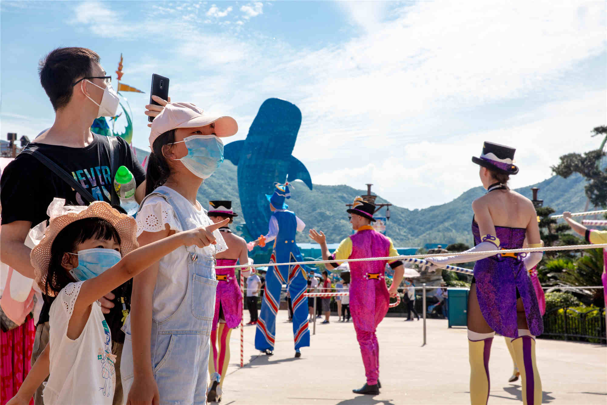 在珠海長隆海洋王國,很多遊客都注意到園區的衛生防疫措施,自覺佩戴口罩,增加洗手次數。在鸚鵡過山車項目處,遊客們按工作人員指引,「之」字形乘坐遊樂。5月1日晚,園區上空出現了千部無人機描繪 「天幕」、「龍」、 「火炬」、「奔跑」等畫面,形成奇幻感、科技感、藝術感十足的立體畫卷,煙花表演也重新呈現在遊客眼前。據報道,珠海長隆海洋王國還是五一期間多個無人機表演項目的拍攝地,包括「致敬勞動者」五一表演等等。