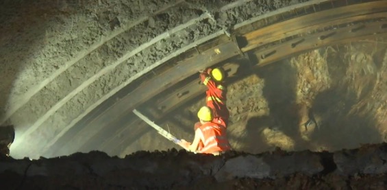 5月2日,記者跟隨中鐵八局昌景黃鐵路二分部工作人員進入施工中的上村隧道。隧道內焊光閃耀,運輸車、鏟車往來穿梭,機器轟鳴不時揚起灰塵。工地上一片如火如荼的緊張繁忙景象,工人們正在為隧道做拱牆襯砌的鋼筋綁紮工作。