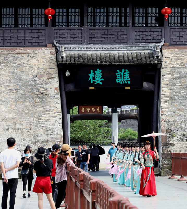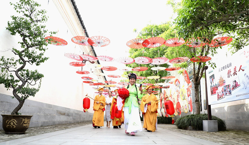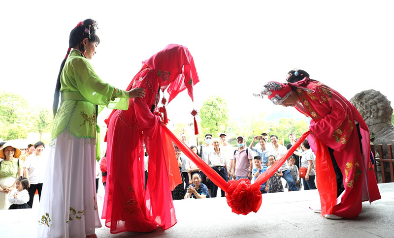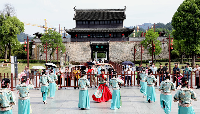【香港商報網訊】5月4日,安徽歙縣徽城鎮中和社區府衙廣場,徽州古城景區演藝人員在表演《徽州婚嫁拋繡球》。