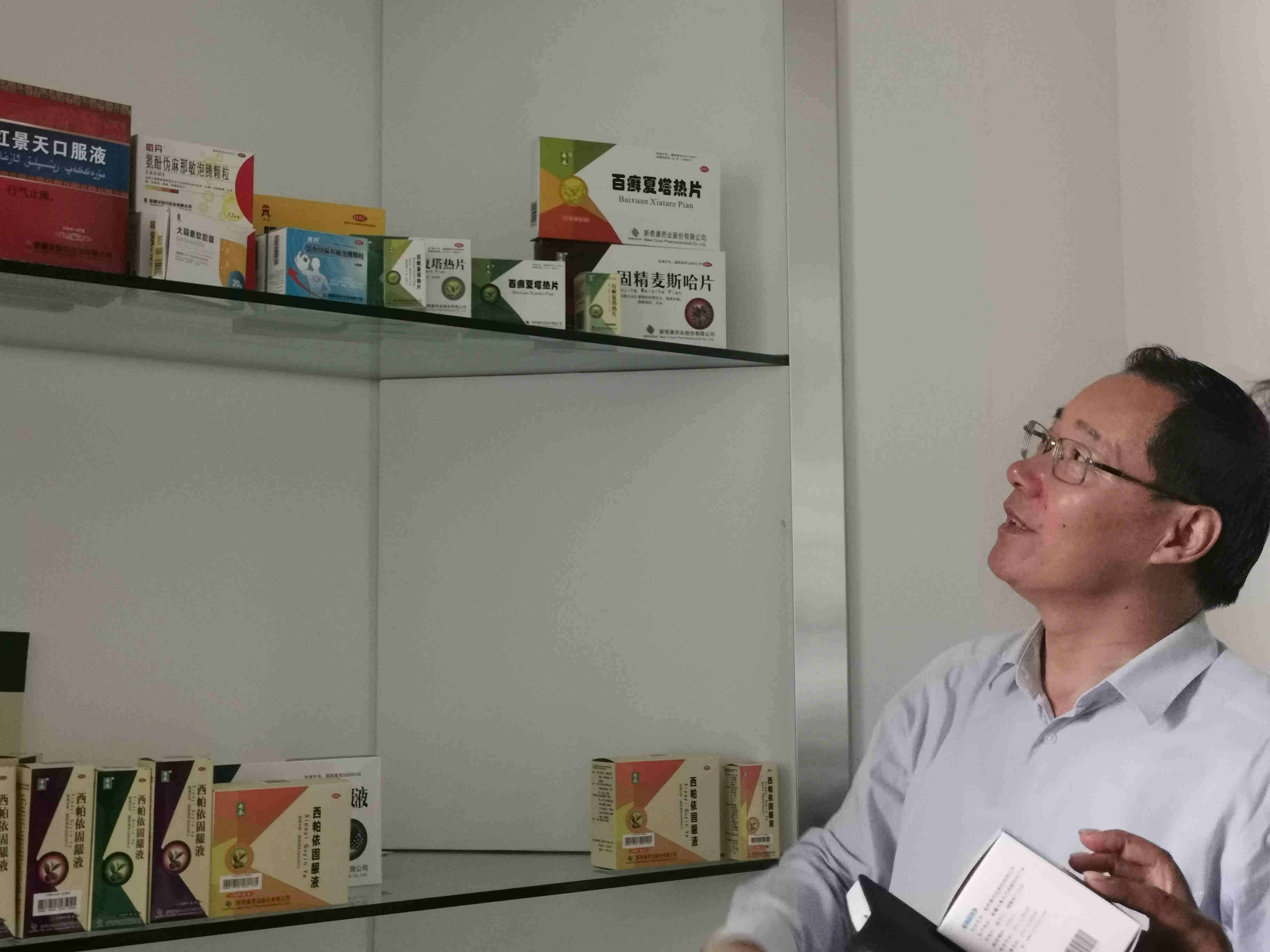 新疆藥品工業協會會長、新奇康葯業股份有限公司董事長陳金成向記者介紹新奇康葯業旗下藥品