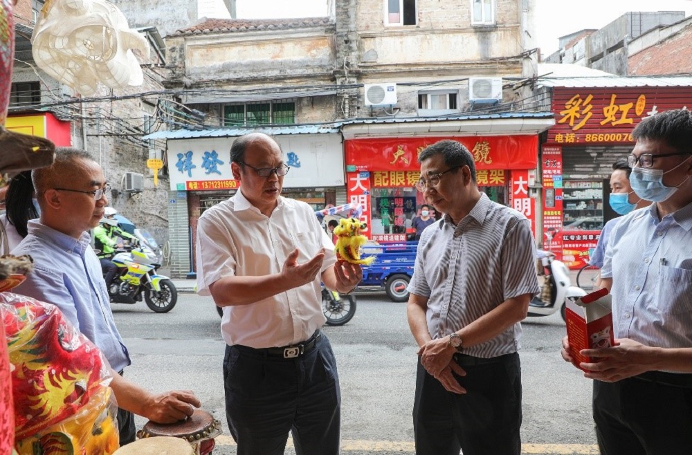 當天,楊曉棠一行先後到太平路、中山路、竹器街等地段,沿途了解德和興醒獅子頭、李全和麥芽糖糖柚皮、新昌鼓等非遺項目和騎樓保護的有關情況。在百年老店「德和興」醒獅店,楊曉棠駐足觀看醒獅頭糊紙等製作流程,詳細了解獅子頭文創產品。