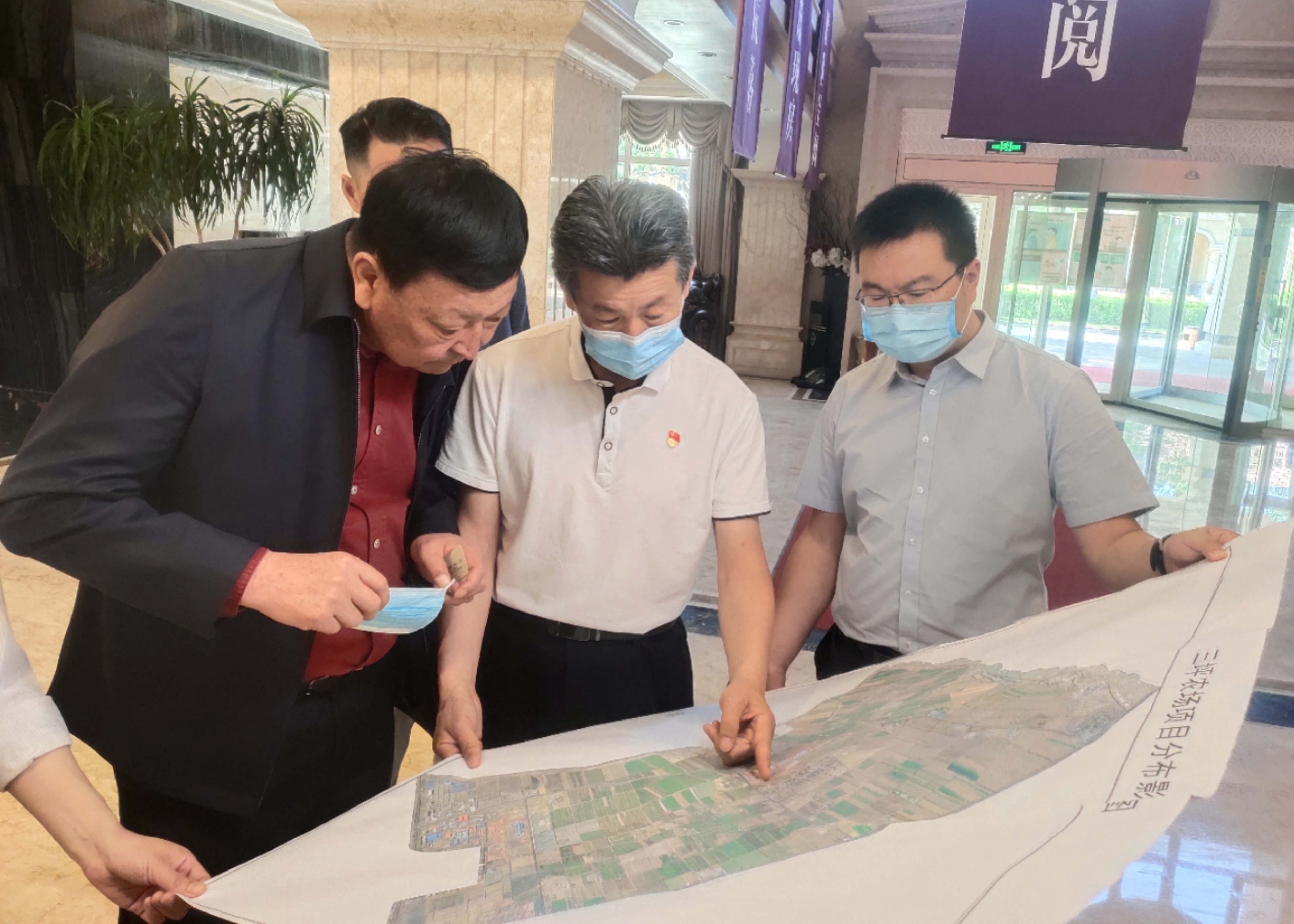 三坪農場黨委副書記、場長靳軍標(中)向企業家新疆亞中集團董事局主席唐德明(左)介紹三坪農場產業布局