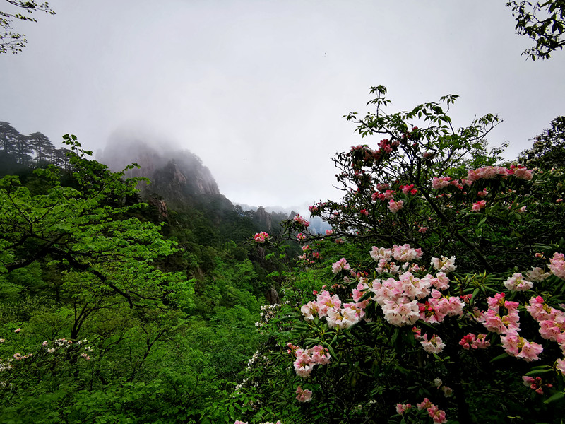 值得一提的是,和別處賞花不同,黃山杜鵑生長海拔較高,因此當雨後天晴,雲海顯現,杜鵑花的粉白和流雲瀑布般的雲海和諧地融為一體,映襯著遠處壯麗雄奇的巍峨大山和蒼健挺拔的青松,如詩如畫,讓人忍不住駐足拍照留戀。