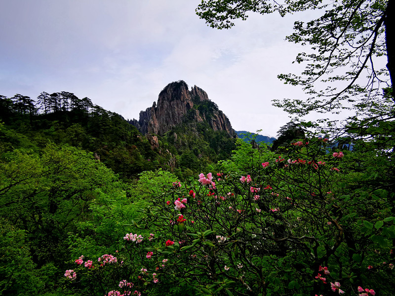 黃山杜鵑小貼士:黃山杜鵑又名安徽杜鵑,杜鵑科杜鵑屬,常綠灌木。安徽省省花。為我國特有的珍貴稀有樹種之一。花期4至5月,果實8至9月。海拔1350米以上的玉屏樓、北海、西海、散花塢、信峰等地均有較大面積分佈。入春以後,山下的木蘭,山上的杜鵑基本上相繼開花。故古詩有“山中可名為二花,木蘭杜鵑並相誇。四月同時爭開放,深紅淺白鬥雲霞”。(吳敏 趙美君 徐翌)