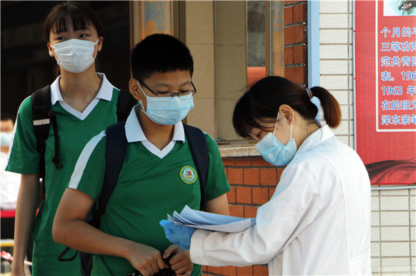 校方在校門入口處設置了多個體溫檢測點,多名教師現場指導學生進行檢測、詢問,隨後陸續進入校門