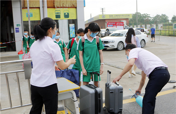 同一天,花都區靈格風中英文學校也迎來第二批返校學生。當天早上7點開始,便有學生在家長陪同下陸續到校,校方在校門入口處設置了多個體溫檢測點,安排多名教師現場指導學生進行檢測、詢問,隨後陸續進入校門。據悉,該校當天共有464名七、八年級學生返校復學。