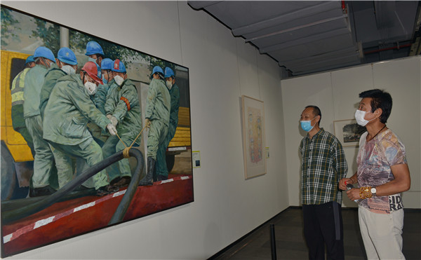 此次展覽中董小明的《院士——戰士》,梁宇、盧衛文的《眾志成城》,陳湘波的《最美逆行者》等許多優秀美術作品,分別從不同的視角歌頌了奮戰在一線的工作人員。在闡述創作理念時,董小明說,在這場沒有硝煙的戰爭中,以鍾南山院士為代表的科學家和醫務工作者以大無畏的英勇氣概和求真務實的科學態度,戰鬥在最前線。其中,盧紹武、陳欽碩、王道國、何玉生、 鄒炯文等書法家創作出一批承載着感動,滿懷着信心,致敬醫務人員,鼓舞軍民士氣,同心驅除疫病的優秀書法作品。