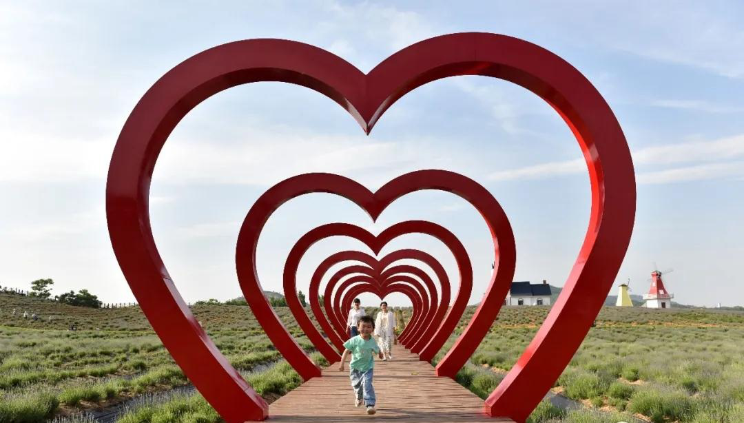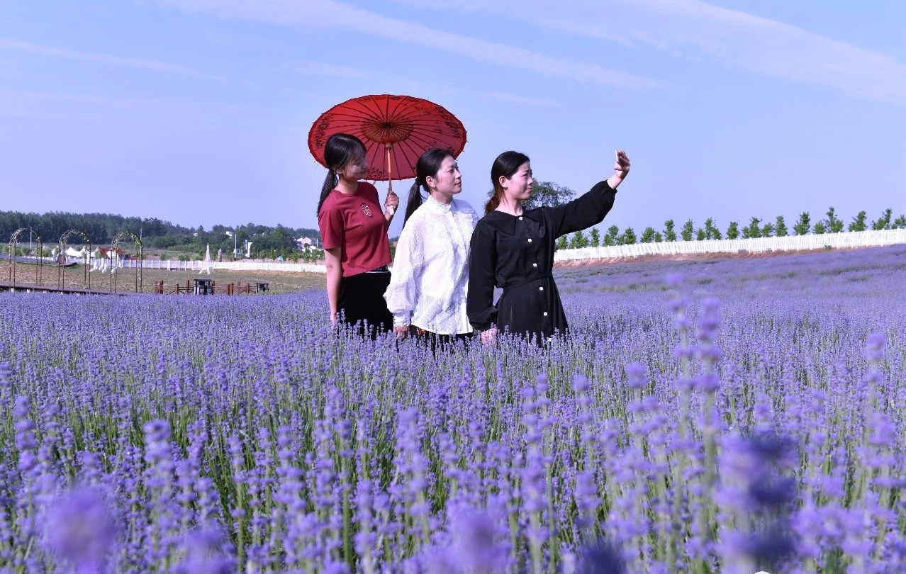 走入尖山湖逸趣園,首先在薰衣草園看到,成片的紫色花朵相繼開放,漫步其中,紫色花海與天空相連,濃濃的薰衣草花香瀰漫空中。沉浸在紫海香溢的花田中,紫花與遊客共舞、香浪與彩蝶齊飛,花海人潮相映成趣。